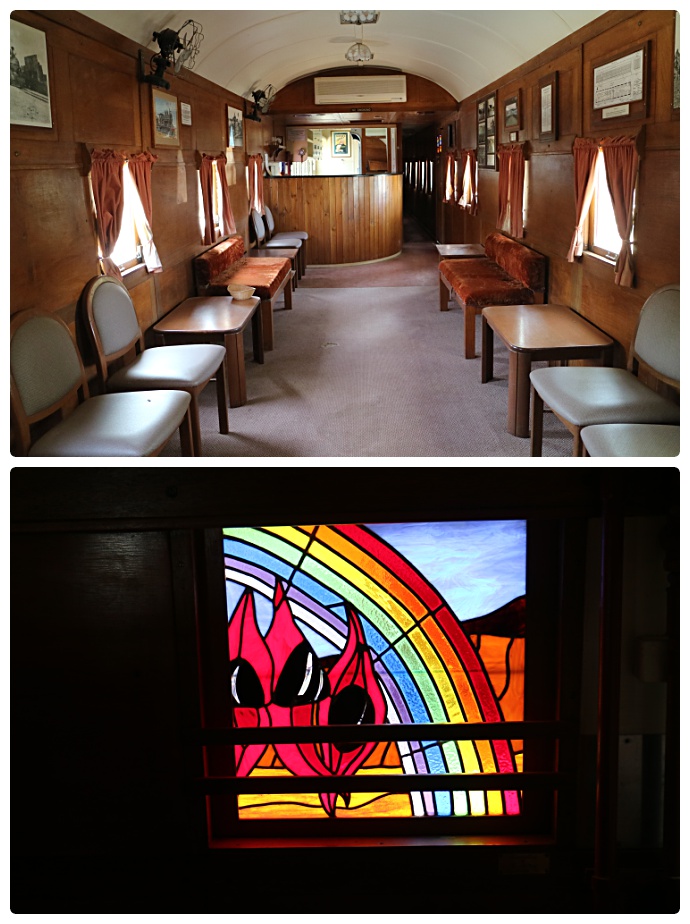 After checking in at Reception, our first destination was to the Ghan Legends Museum which features the locomotive NSU58 which was one of the first diesels to take over from steam trains. We took a walk through the train and it was interesting to see the dining and bar cars and compare what was considered luxurious then with how we regard luxury today. The galley is so small when you consider the number of meals that it had to prepare on its journeys. There were some very nice stained glass windows, a bit surprising on a train!