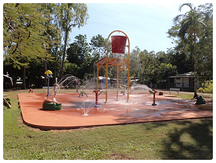 These days it’s a great place for families to relax – there are BBQs, a toddlers’ pool, walking tracks, an adventure playground, and much more. Swimming is no longer allowed in the weir itself but it is stocked with several different species of fish, including barramundi, grunters, tortoises and so on. The water is quite clear and small and large fish can be spotted by the observant watcher. There are some water bubblers in the weir to keep the water moving and we swear we saw some very large barra enjoying something of a spa bath effect on the bubblers!