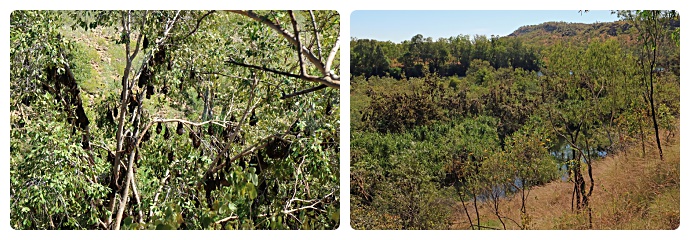 Fortunately the Nitmiluk Visitor Centre was air-conditioned so we went inside to cool down before deciding to order an early lunch. Thinking we would be OK weather wise we ate our lunch on the shaded deck overlooking the river. Our view, however, was dominated by hundreds, maybe thousands of bats! They filled all the trees in front of the deck and although they had some novelty value worth a few photos to start, I’m sure that all visitors would have preferred more of an unspoiled view of the river and scenery in general.