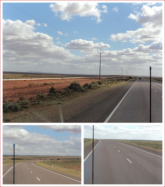 From Pimba we headed north through Woomera. This is very much dry, arid country with red rocky soil. With only low vegetation, the power pylons stand out against the sky. We assume that they take power to Roxby Downs and Olympic Dam.