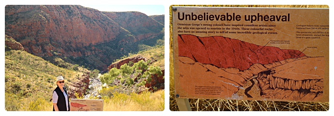 The Ghost Gum Walk takes you along the edge of the gorge and up many well-made stairs. In places there are metal balustrades as a safety measure and something to hang onto. We both made it to the main lookout, which is a sizeable metal structure that can only have been lifted in by helicopter. From the lookout platform there were views across to the carpark and camping area, plus along the creek and the gorge itself. Spectacular views to say the least!