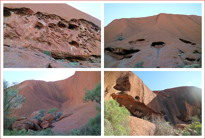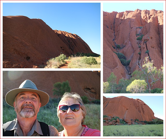Our walk started in the shade but eventually the sun caught up to us and it became quite hot and sticky – and zillions of flies. We did this walk 24 years ago but since then fences and barriers have been erected in places to keep visitors at a distance from the more sacred places. There are more designated walkways and boardwalks and a lot more interpretive signs. In other words its being more properly managed now. Much of the area is under a revegetation program and places we went so long ago are no longer accessible and/or visible. With recent rains Uluru is very green and there is plenty of long grasses and other shrubs and trees surrounding the place. There is a surprising amount of vegetation growing on even the highest parts of the rock.